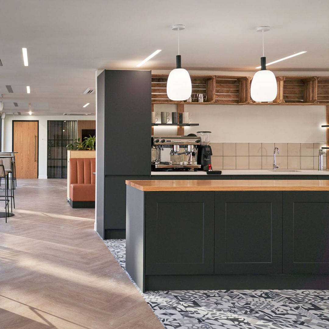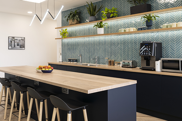 Our engineers installed integrated instant boiling water taps into the kitchen worktop, as well as a commercial bean to cup coffee machine. A beautifully designed space, with refreshment facilities to match.